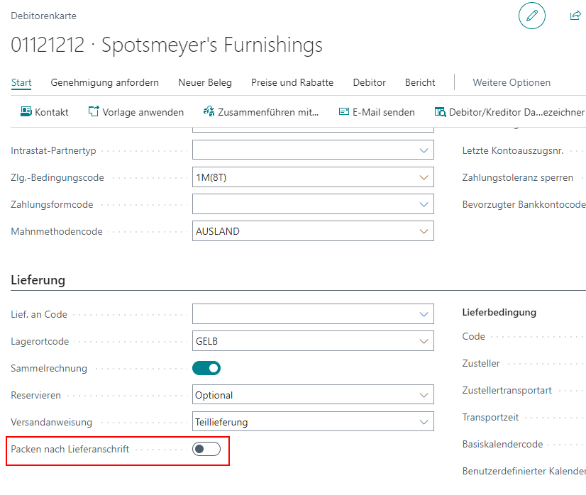 Standardverhalten (Kennzeichen "auftragsweise" = True, "Lieferanschrift" = False):