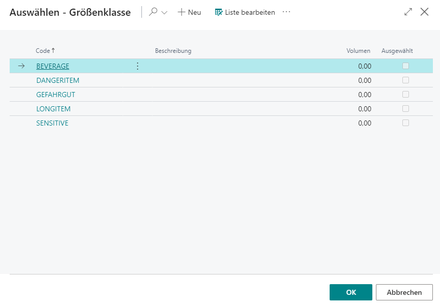 Wählen Sie aus Volumeneinheit, Längeneinheit und Gewichtseinheit eine Basiseinheitsart aus und weisen Sie dieser einen Einheitencode zu.