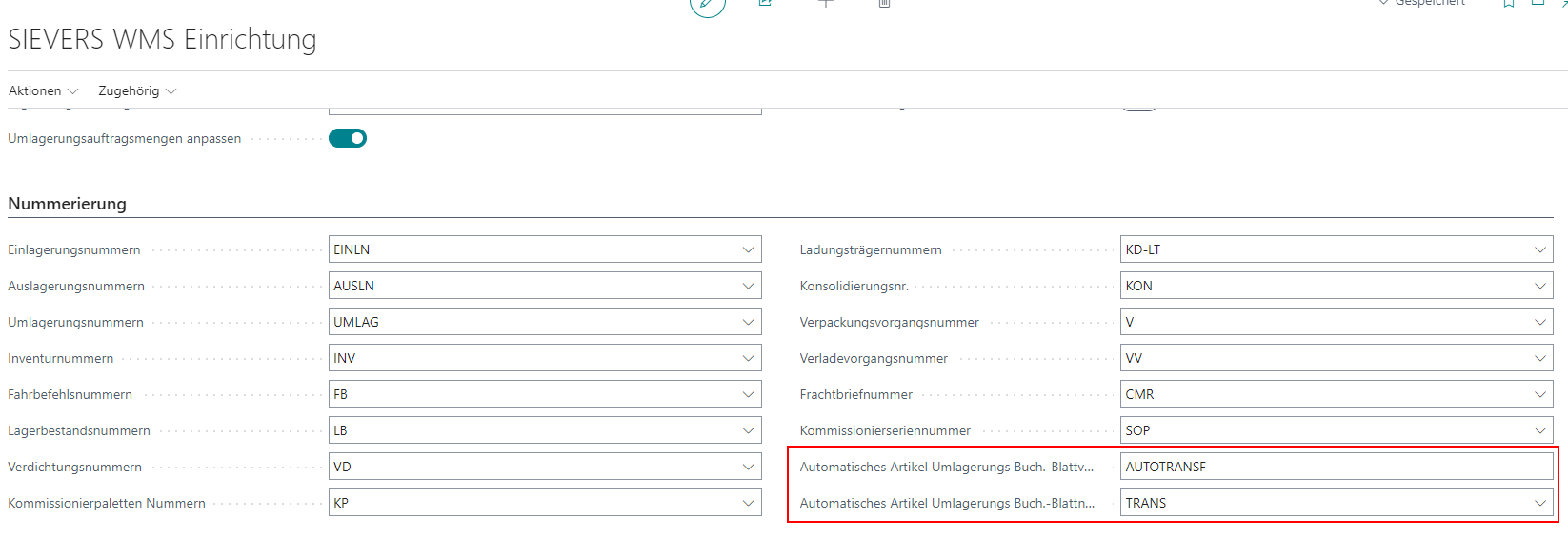 Richten Sie in der SIEVERS WMS Einrichtung die Nummerierungen Automatisches Artikel Umlagerungs Buch.-Blattvorlagenname und Automatisches Artikel Umlagerungs Buch.-Blattname ein.