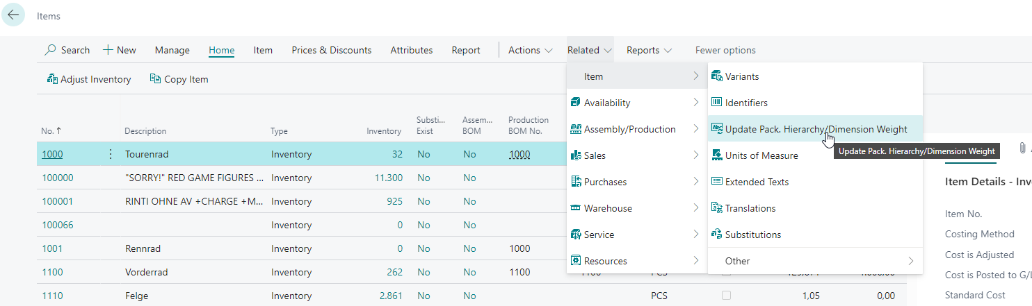 - Sync. Weight in Pack. Hierarchy Entries: Activating this option means that if the gross or net weight of the smallest storage unit in the packaging hierarchy changes, the other entries can be adjusted automatically. Before the change, there is a confirmation prompt. For example, the formula ‘number of pieces of stock ÷ number of pieces of smallest storage unit * gross weight of smallest storage unit = new gross weight of stock’ applies. This formula also applies to the other lines and the net weights. For the smallest storage unit, the following applies: ‘Gross weight of inventory ÷ number of pieces of inventory = new gross weight of smallest storage unit’. This also applies to the net weight.