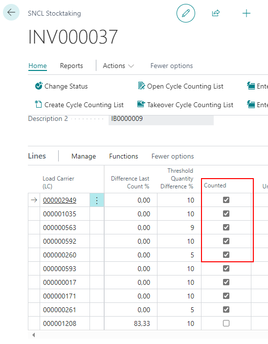 If there is already an open 2nd or 3rd count, the inventory management can still decide to use the last count value. For this, the inventory management activates the Counted checkbox in the SNCL stocktaking. The open cycle counting list is given the new status "8-Deleted/Discarded" so that it is clear that this cycle counting list has not been processed, but the last count value has been transferred to the stocktaking journal batch.