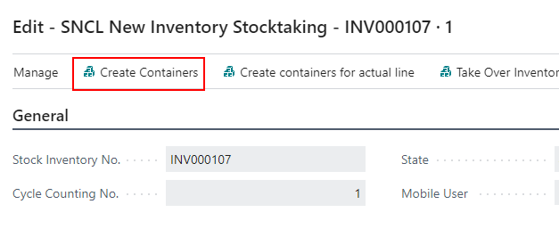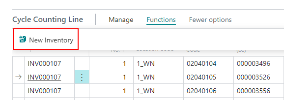 The new function New Inventory is also available on the Cycle Counting Lines. When you selected a specific line, the storage place will be entered as suggestion in the New Inventory form.