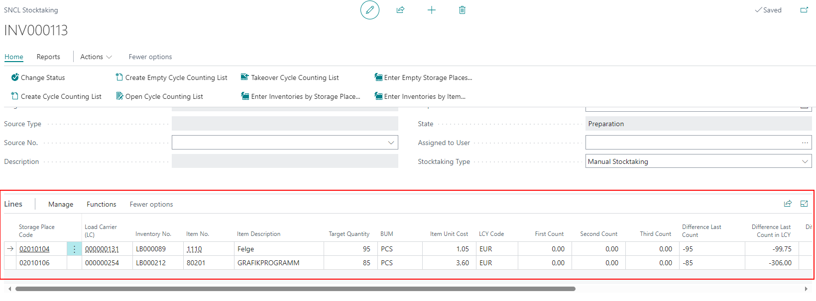 - If a line containing a target inventory is selected, the new inventory is displayed as an additional line exactly below the corresponding storage place after the "new inventory" function has been processed.