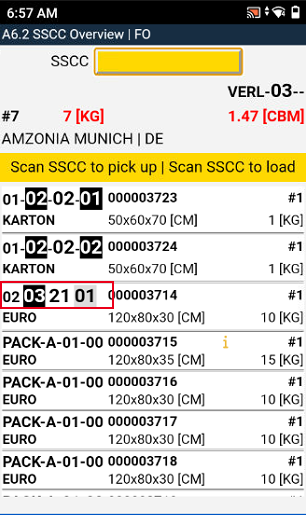 This page is opened by the action Change View in menu B of A6.1 and A6.2. This page shows the currently loaded SSCC of the selected loading process. These SSCC have been scanned two times in the loading process. A third scan of an SSCC will unload it and change its state from 8-Loaded to 7-Packed.