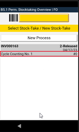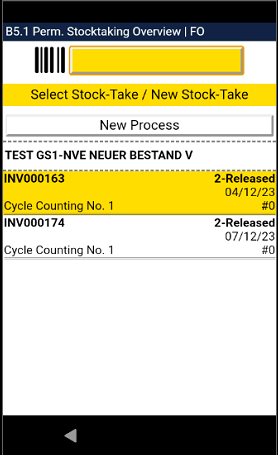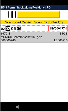 Here you can scan a Storage Place. After this, the MDE will then open B3.2 Perm. Stocktaking Positions, where you can tap on and correct the inventory you want to adjust. This whole process will take place in a SNCL stocktaking with the type Inventory Correction MDE.