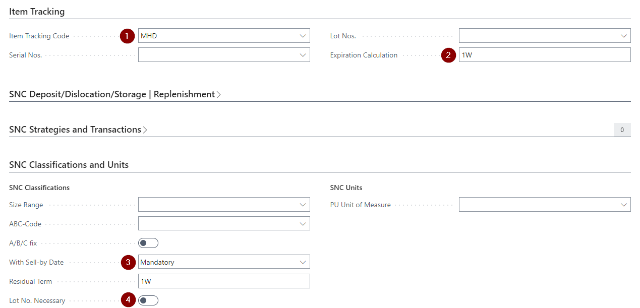 If you entered an Item Tracking Code (1) and an Expiration Calculation (2), the With Sell-by Date (3) Option in SNC Classifications and Units will be automatically set to Mandatory. Also the Residual Term (4) will be filled with the Expiration Calculation (2) value.