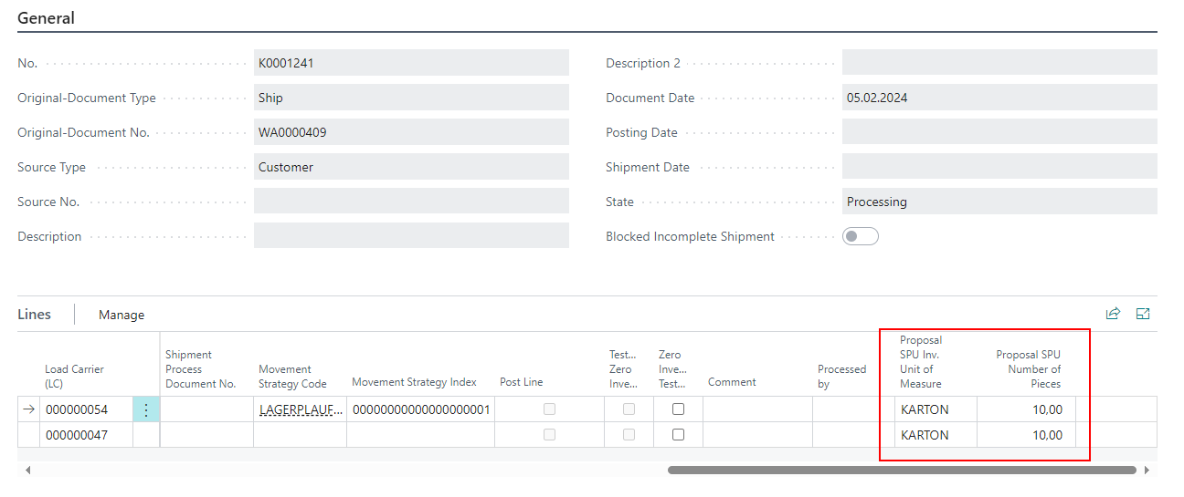 The first field is used to determine whether and with which SPU the Outbound Stock Post line can be picked. The SPU with the lowest level number in the packaging hierarchy is specified first. The Number of Pieces field shows how many of these SPUs are required.