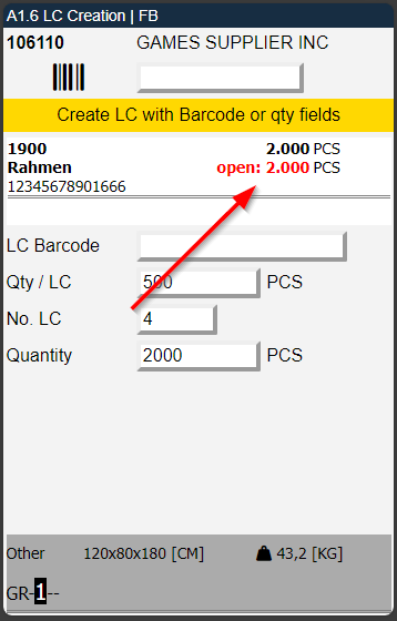 Added field to A1.6 LC Creation which shows the open Quantity - Items 75752 and 75756