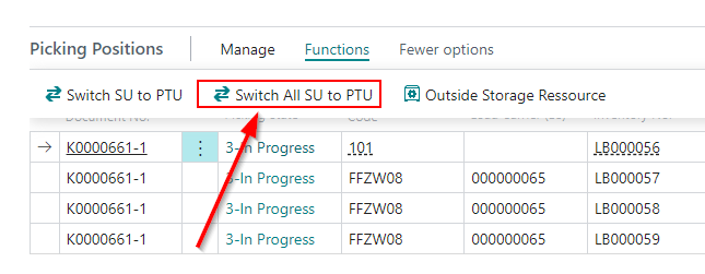 In picking, you can currently use the Switch SU to PTU function to convert a selected SU into a PTU if the entire inventory is reserved for it. The function is basically very practical, but it is tedious to do this manually for all lines one after the other. For this reason, there is now a button that performs the function automatically for all picking lines for which the entire inventory is reserved and which are not already PTUs/NVEs.