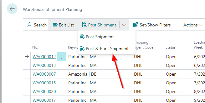 We have added the new action Post & Print Shipment on the warehouse shipment planning. At the moment, pressing it will always post the warehouse shipment and print the shipment note.