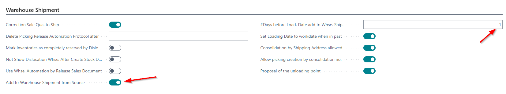 We recently added the field #Days before Load. Date add to Whse Ship. to the SIEVERS WMS setup. This field can be used to determine how many days before the loading date new lines can be added to the warehouse shipment. It is now possible to enter negative numbers in this field. This means that new lines can still be added to the warehouse shipment on the day of loading.