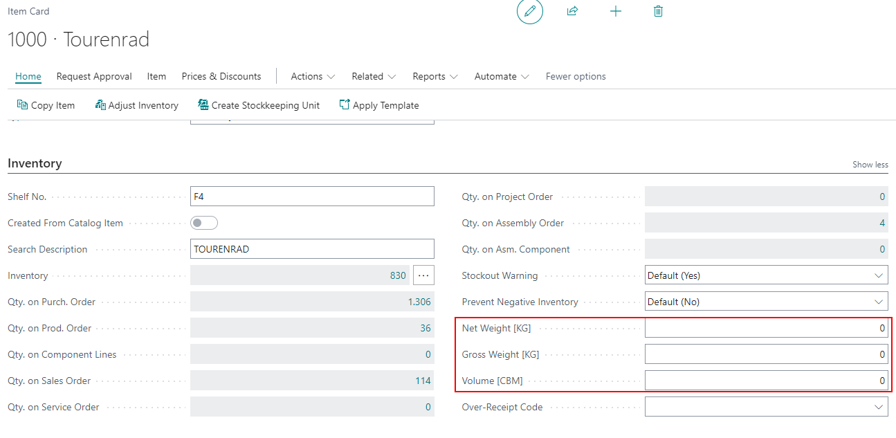 We have integrated the units from the Base Unit Of Measure List into the dimension and weight field captions on the item card. In addition, we have removed the fields created specifically for the purpose of displaying the unit.