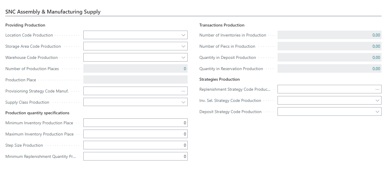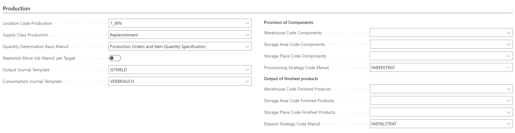 - Location Code Production: Defines where production takes place, where the components are made available and the finished product is posted