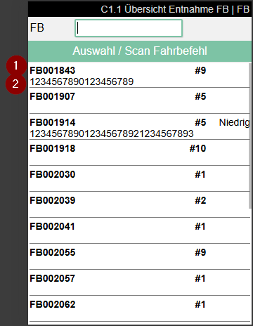 Hier kann sich der Lagermitarbeiter informieren, wie viele und welchen Fahrbefehlszeilen der ausgewählte Fahrbefehl enthält und diese nacheinander abarbeiten. Hierzu wird zuerst ein Ladungsträger (stets eine LE) eingescannt und anschließend werden die Positionen abgefahren.