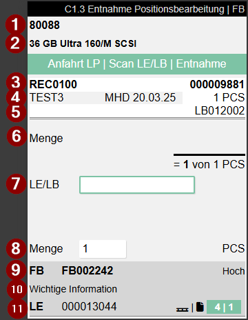 Wie in A4.3 scannt der Nutzer den angepeilten Ladungsträger bzw. einen Lagerbestand und bestätigt anschließend die zu entnehmende Menge. Danach wird die nächste Position in C1.3 angezeigt.