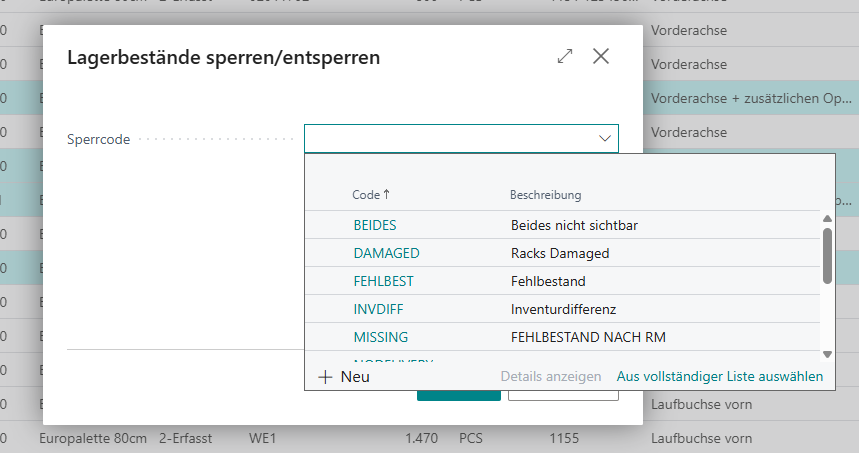Wenn Sie Lagerbestände entsperren wollen, wählen Sie Lagerbestände mit gleichem Sperrcode aus und entfernen diesen anschließend über Lagerbestände sperren/entsperren.