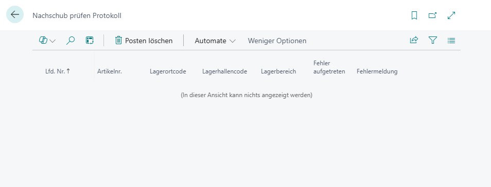 Im Rahmen der Behebung eines Fehlers, durch den der Nachschub Prüfen-Prozess gestoppt wurde, haben wir die neue Tabelle und Page Nachschub Prüfen Protokoll implementiert. Wenn während des Nachschub prüfen-Prozesses ein Fehler auftritt, wird dieser hier protokolliert. Die Einträge können via Posten löschen entfernt werden.