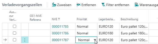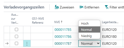 Es gibt nun die Möglichkeit, pro NVE im Verladevorgang eine Priorität zu vergeben. Die Vergabe einer hohen Priorität sorgt dafür, dass diese NVEs durch den Verlader als erstes gesichtet und verladen werden. Alle NVE bekommen standardmßig die Priorität Normal, bis die manuell verändert wird.