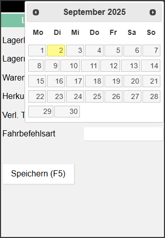 Wird an diesem Feld ein Datum eingegeben, filtert das System die Fahrbefehle nach Verladetermin jünger als das eingegebene Datum.