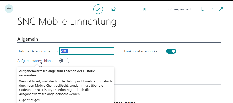 Es gibt nun die Möglichkeit, die Mobile Historie über eine Aufgabenwarteschlange löschen zu lassen. Aktivieren Sie hierzu die neue Option Aufgabenwarteschlange zum Löschen der Historie verwenden. Diese Option schaltet die Löschung durch den Client ab. Erstellen Sie stattdessen einen Aufgabenwarteschlangenposten mit der Codeunit 70294093 "SNC History Deletion Mgt." und vergeben Sie die gewünschte Uhrzeit.