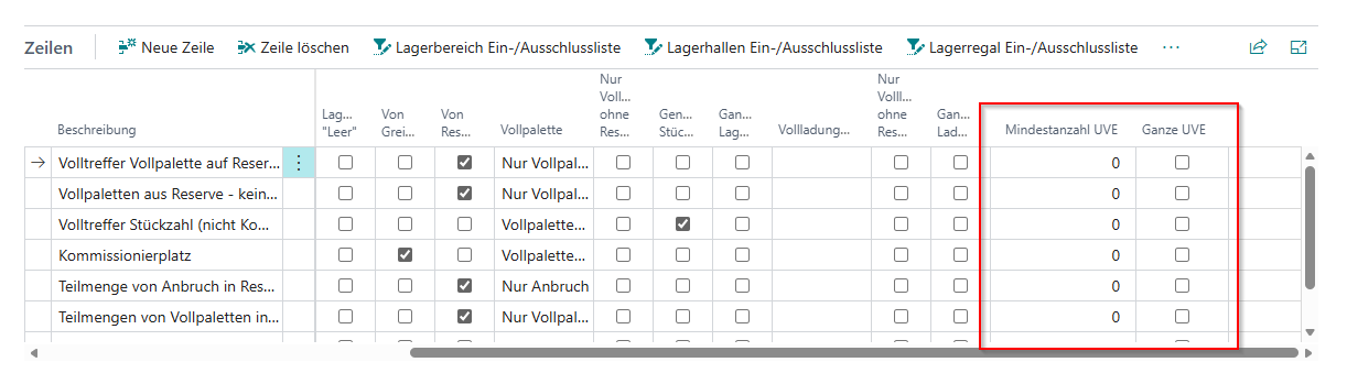 Das neue Feld Ganze UVE aktiviert eine Logik, die sicherstellt, dass UVEs vollständig und ohne Mengensplittung über mehrere Ladungsträger reserviert werden. Das System versucht dabei, die benötigten UVEs von so wenigen Ladungsträgern wie möglich zu entnehmen.