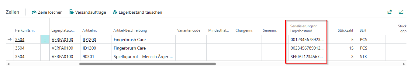 - Kommissionierbelege: Das Feld wird neben der Seriennummer angezeigt und ist manuell editierbar.