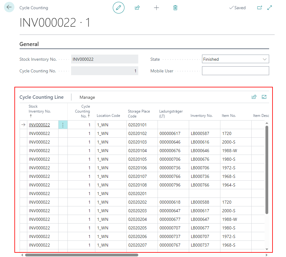 Until now, there was no feedback when creating a cycle counting list after starting the corresponding action on the inventory card. The user could not know whether the creation was successful or not. For this reason, the cycle counting list is now opened automatically as soon as it is created. If the creation failed, there will be an error message.