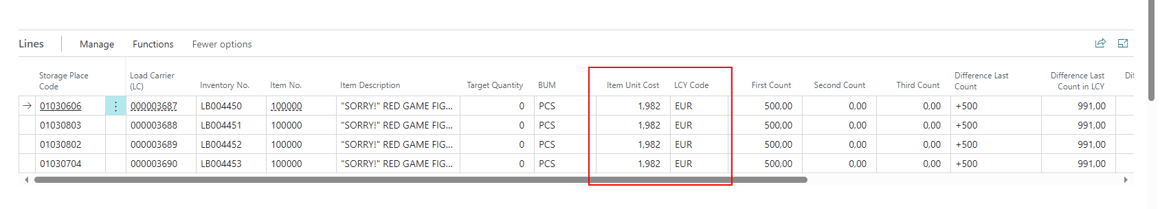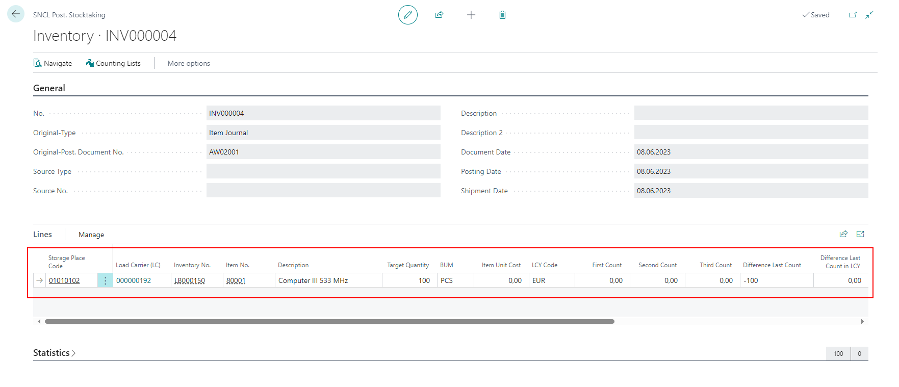 - If a line containing a target inventory is selected, the new inventory is displayed as an additional line exactly below the corresponding storage place after the "new inventory" function has been processed.