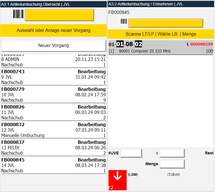 Previously, there was a restriction in the item transfers that prevented inventory in replenishment from being processed with the number of pieces equal to the number of pieces in the move order. This restriction has now been lifted. Item transfers with inventory move jobs can now be carried out with any number of pieces.