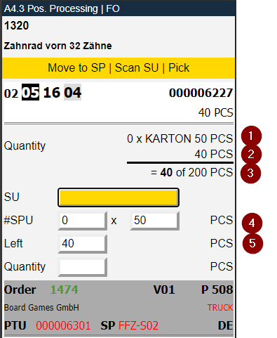 To further improve the picking process, we have added a check that verifies whether storage units can to convert a full pallet from SU to a PTU, the employee scans the SU directly in A4.2 the picking pos. overview or in A4.3 in the position processing. It is not necessary to scan a blank barcode. Currently, a PTU or a blank label is still expected after scanning the SU to confirm the pick. The employee is now spared this step if a full pallet can be picked.