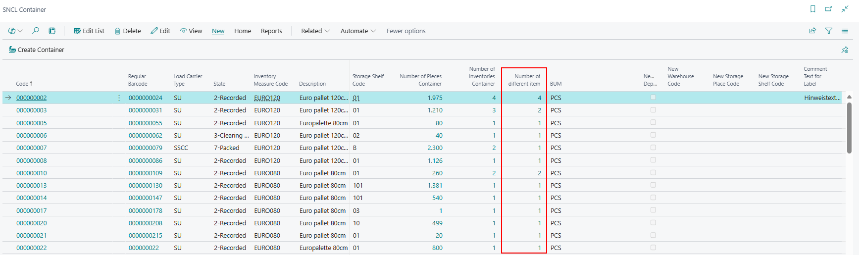 We have added the column Number of different items to the SNCL Load Carrier list. This is where the number of items on the load carrier is determined and shown. It is a calculated field with a lookup to the inventory list, so you can click on it to see the inventories.