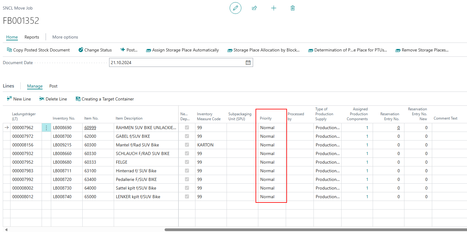 It is now possible to change the priority of individual move job lines. If you change the priority in the document header, all lines will inherit this priority. Please make sure that you have inserted the field via Personalize.