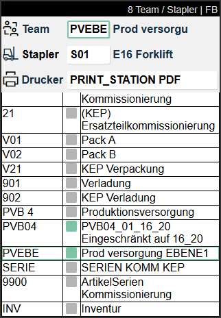 In this example, the squares are all gray. This means that there are still tasks in every area. The next screenshot shows the team/forklift selection. Here there are teams that have completely finished their work. Their squares are green: