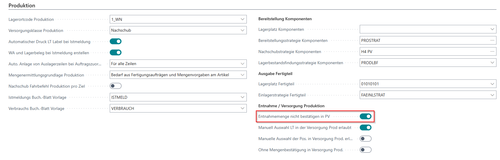 The option field No confirmation of take out qty in PS was previously still located in the Internal Transports section. However, since it referred to production supply, we have moved it to the Production area. It can now be found under the heading Withdrawal / Production Supply.
