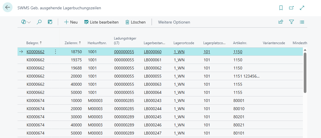 The column view of the outbound stock post lines list has been aligned with the subpage of the outbound stock post (38 columns incl. Serialization No. Inventory).